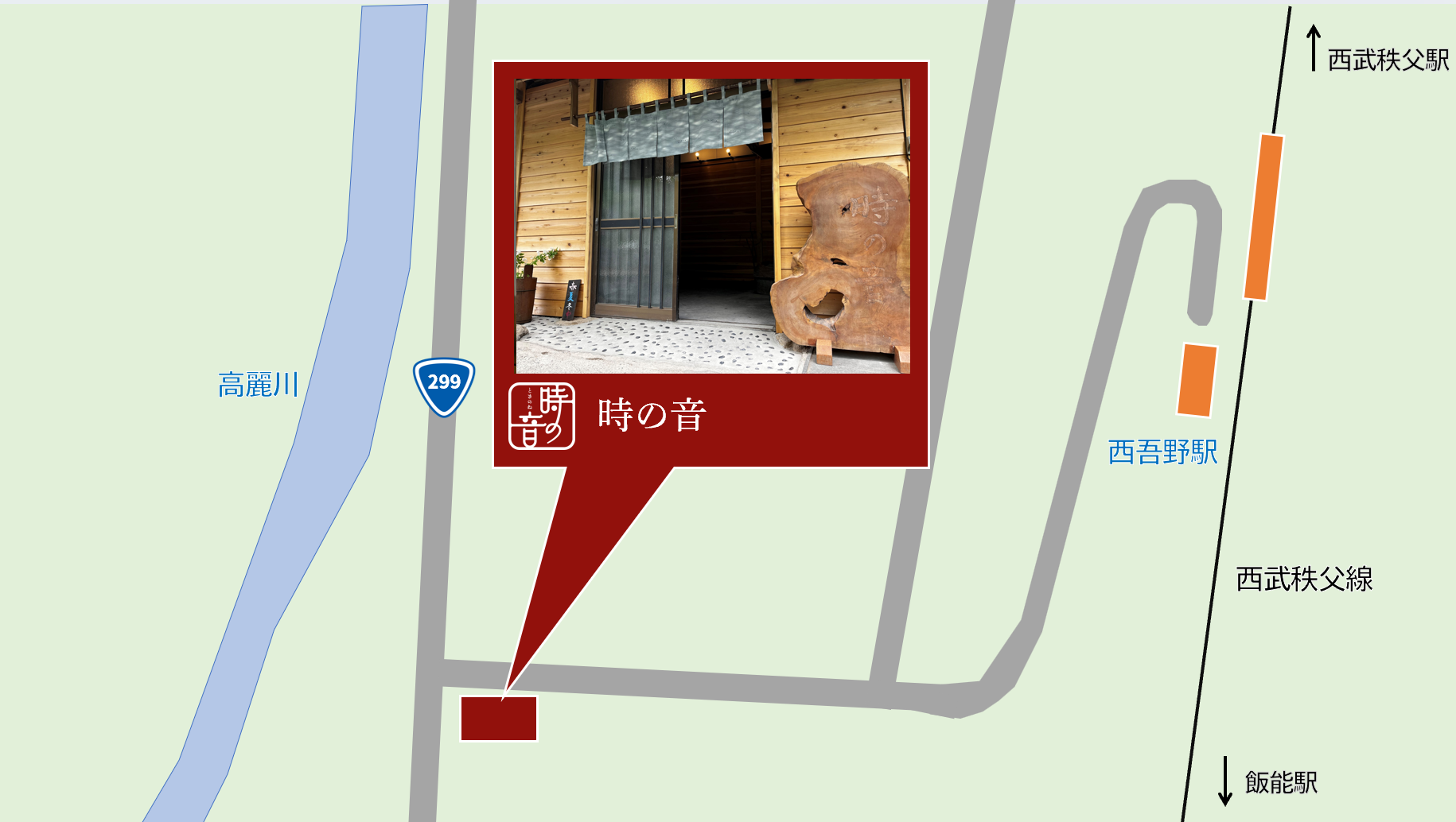 「時の音」は埼玉県飯能市にある西吾野駅から徒歩5分の立地にあります。